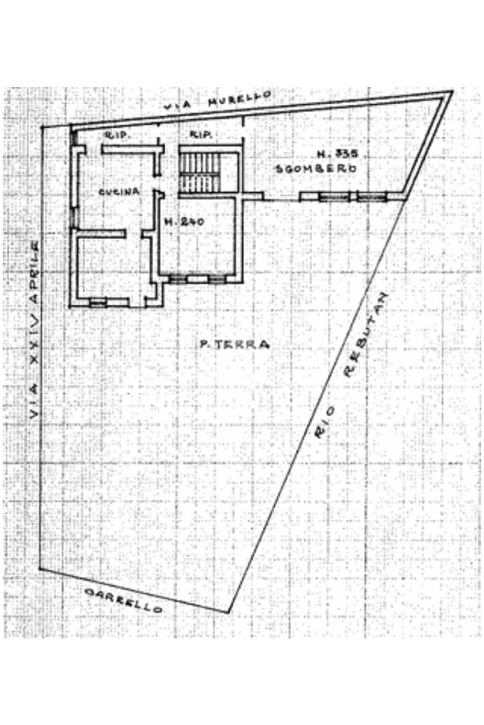 Piano terra: cucina, soggiorno, bagno, camera matrimoniale, giardino e garage/magazzino.
